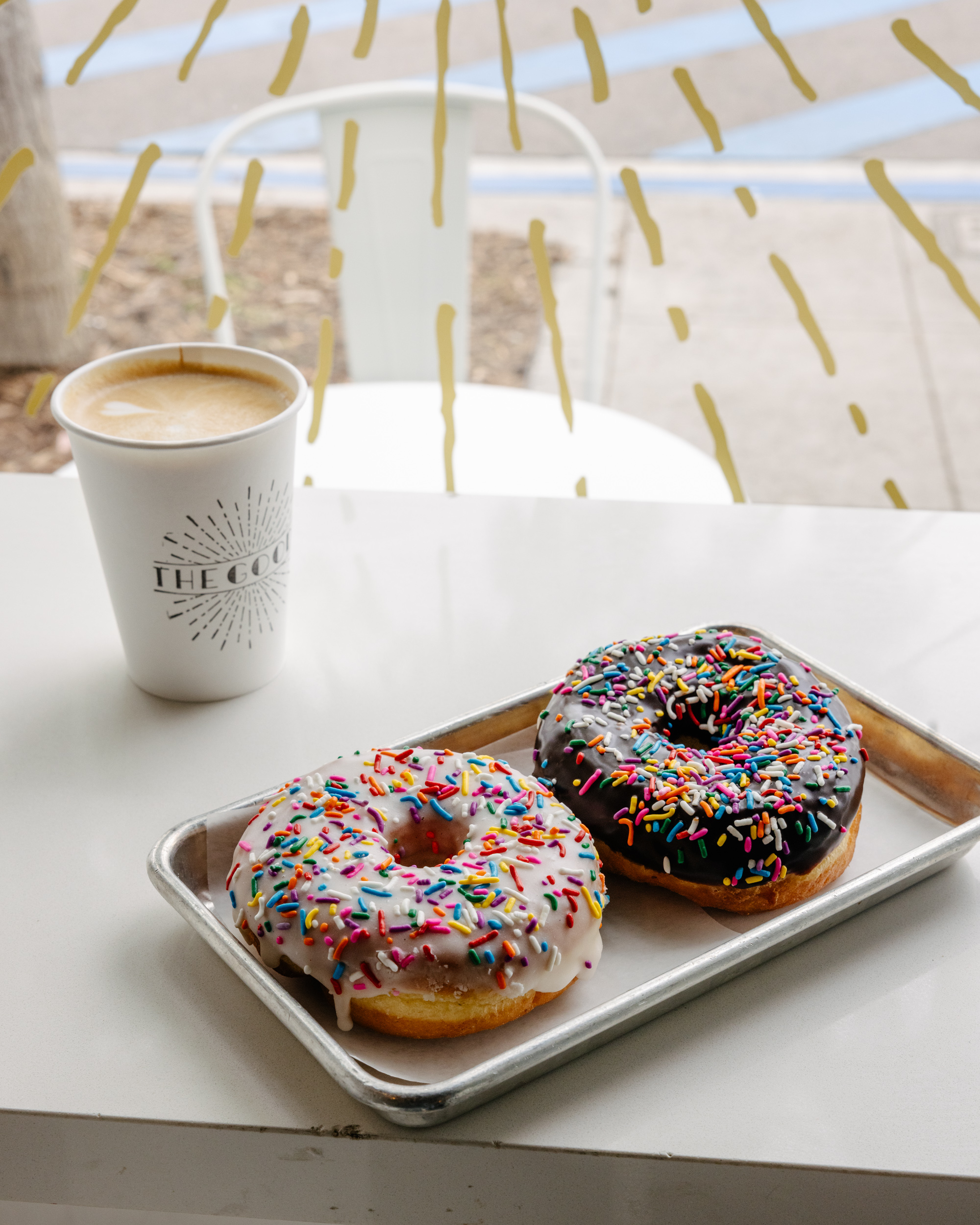 For something sweeter, we wandered into The Goods, home of the best donuts in town. These are not modest donuts. These are monster donuts. Fido is allowed inside, which meant Honey could stand proudly beside me while I sipped coffee and debated flavors. She supervised closely, just in case.