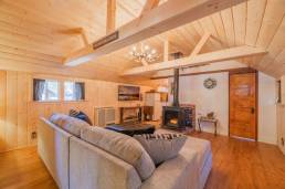 The check in process at Big Bear Cool Cabins was mindful of social distancing and close to the cabin. The cabin we chose, Cozy Pines Retreat, had a dog door in the kitchen that lead to the spacious backyard which is fenced and included a small bench in the yard and a Weber barbeque grill. The interior was very rustic and clean with a full kitchen including dishes and cooking pans plus a refrigerator and microwave.