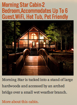 Sundown Cabin Rentals Morning Star Cabin offers 2 bedroom accommodations, WiFi, Hot Tub and best of all, is FIDO Friendly!