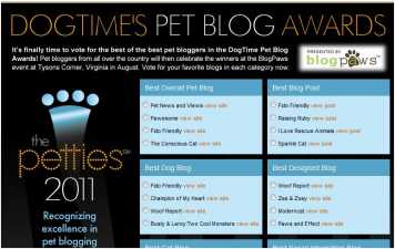 Follow this link: http://dogtime.com/petties.htmlOnce there, we'd wag and send a tummy rub if you'd vote for us in Best Overall Blog, Best Dog Blog, and Best Blog...