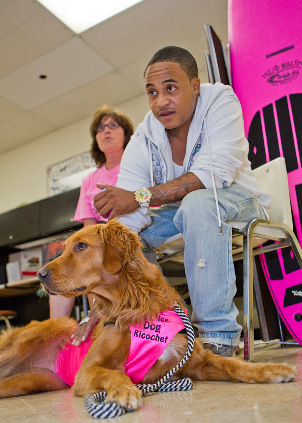 4-Orlando sits with Richochet the surfice dog who has raised over a hundred thousand dollars for charity. http://www.surfdogricochet.com/