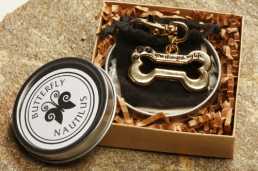 Large gold dog charm with jet stones - This magnificent solid dog bone charm measures just a little over 2" and is 3/16" thick. Suitable for large breed dog. Three Swarovski crystals on the front. Can be used as a keychain, purse charm, or of course, hanging from Fido's neck. $50; (smaller pewter also available for $30)