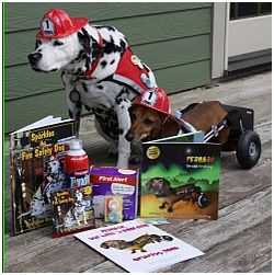 April 8th and 9th, 2010 were no ordinary days for two dogs known for inspiring others. Sparkles the Fire Safety Dog, along with her owner Firefighter Dayna Hilton, made the almost 900 mile trek from Clarksville, Arkansas, to Elkhart Lake, Wisconsin, to meet Frankie the Walk ‘n Roll Dog and her owner, Barbara Techel, in person (and “dog”) to work on some very special projects.