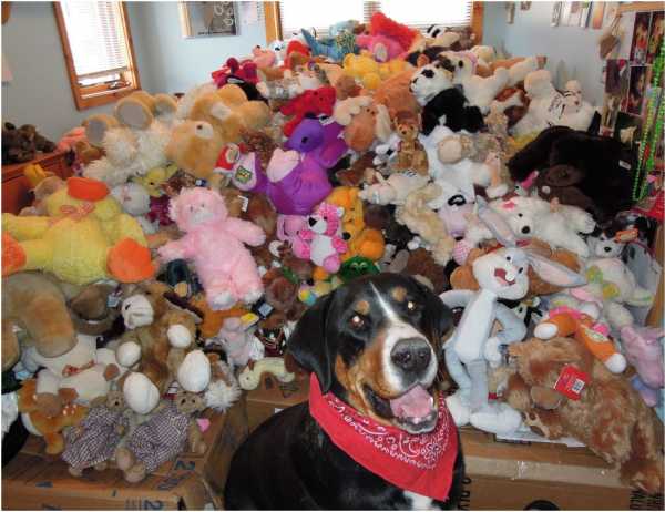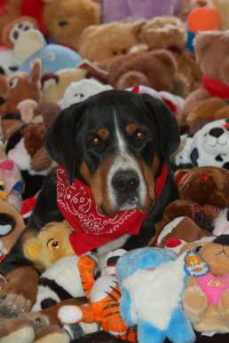 Stacey is a 4 year old Greater Swiss Mountain Dog who collects teddy bears & stuffed animals for sick kids in the hospital. When we heard of this, of course our heads turned sideways and our curiosities were piqued. So we asked Stacey’s dog mom a bit more about this canine super dog and her philanthropic ways.