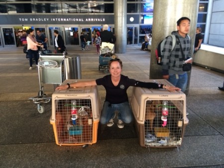 While on medical recovery, the foster families will be a crucial part of Cinderella and Leanne’s emotional recovery. Center adoptions staff member Janet Conley was there when the dogs arrived at LAX. “The flight alone had to be a huge ordeal for these dogs,” stated Conley, “and the original circumstance they both came from was very traumatic. But animals are amazing. They have an incredible capacity to forgive and a desire to learn to trust again. Both of the dogs are very sweet. Cinderella is a bit more friendly and open to human contact but I was actually amazed at how quickly they both seem to be adjusting. It’s as though they can sense there are good things on the horizon. ”