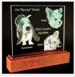 As part of your order, they will also engrave a pet’s name, a quote/caption, and dates if you desire. You also choose a base style to display the glass portrait etching on (beveled, pyramid or rustic) and the color of the wood (light, medium, dark). Each base has a 7-watt light with easy switch on-off cord. They take special orders and are able to work on the color you desire in the base to match your surroundings.