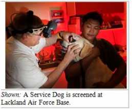 As part of the program, a team of ACVO doctors hosted a Service Dog screening event at Lackland Air Force Base (AFB) in San Antonio, Texas at the Department of Defense Military Working Dog Center. Approximately 150 Transportation Security Agency (TSA) dogs and military working dogs were screened.