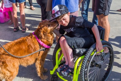 Play is used as a vehicle to bring diverse populations together which fosters camaraderie, team work and relationships. Play is facilitated by Ricochet as well as therapy, service and emotional support dogs which deepens the human-animal bond. For kids who tend to get sensory overload, or prefer to be quiet, a craft and game table is provided so every child feels included. Ricochet is committed to reducing the suicide rate, social anxiety, isolation and exclusion as she unites and enriches the lives of veterans and civilians of all abilities and backgrounds. The mentors and kids make a connection with, and through Ricochet like this young man who is a double amputee. They end up empowering each other! The transformation that occurs when these diverse individuals are brought together with Ricochet is truly magical.
