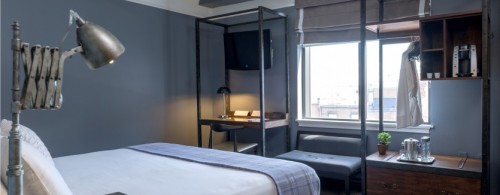 Guestrooms are custom-designed with the unique architecture of the historic Flatiron building in mind. Rooms are painted a deep slate blue and furnished with industrial inspired modern open frame wardrobes, softened by fisherman’s knit bed scarf in a classic plaid pattern over a tufted bed. Work-spaces are punctuated with ergonomic desk chairs reminiscent of classic Scandinavian design and bathrooms feature custom designed vanities with Calcutta marble tops. The Boxer utilizes the charm of the building’s unique shape to provide a new and different experience with each room key.