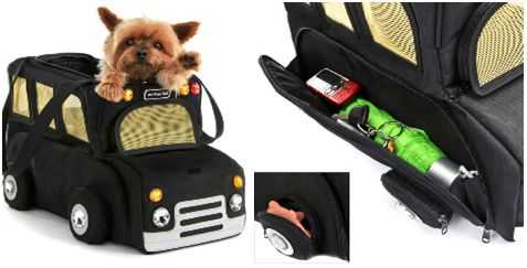 The zippered compartments all hold your valuable items. The wheels on the bus may not go round and round, but they can hold items such as doggie treats or keys while the side compartments can handle bigger items as pictured. Quality construction and mesh windows are just a few details that make the Mommy Bus a great dog carrier. Easy access top entry works well for shall we say it, the family cat? The bus has handles and strap for carrying your furry companion and comes with a washable bottom pad cover.
