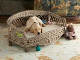 The wicker bed is beautifully designed and very sturdy; it would have to be in my household with its furry denizens and visiting guests of the canine set.