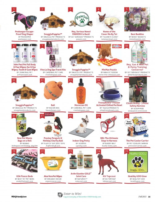On December 1, 2013, we will launch our super popular (annual) 25 Days of Gift Giving Contest. You will be able to enter daily, and here are the FIDO Fabulous prizes - we are so excited to share them with you! Enter daily at Facebook.com/FIDOFriendlyMagazine.